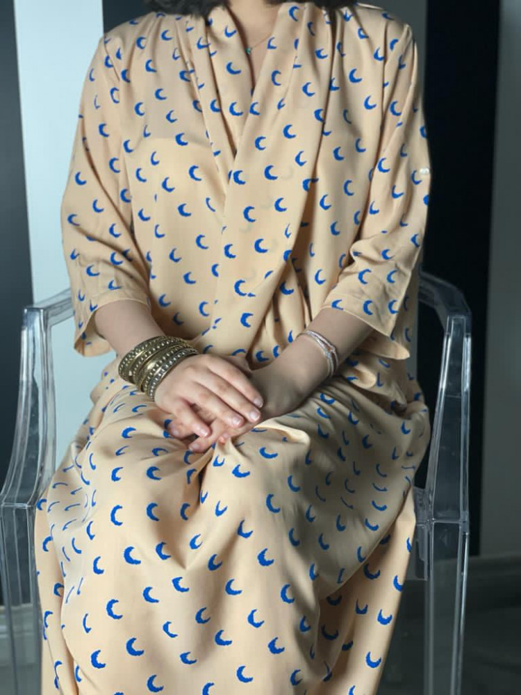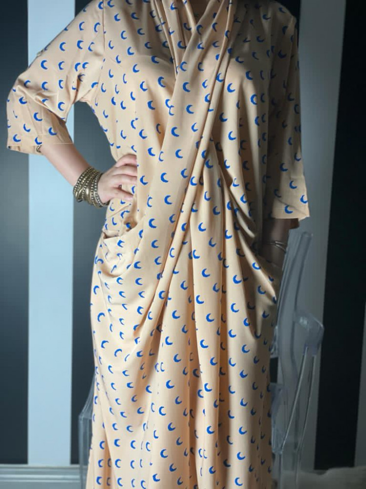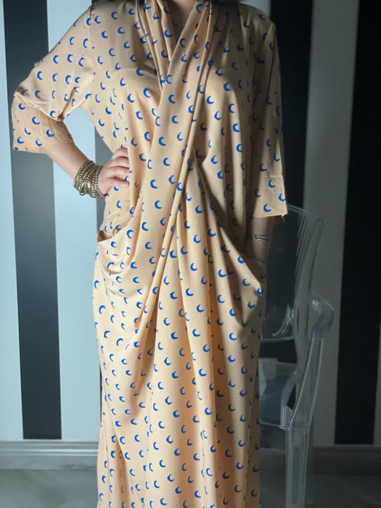 ثويب لف بخامتنا الباردة وبنقشة تهبل، الأكمام قابلة للتعديل تلبسينها بطريقتين