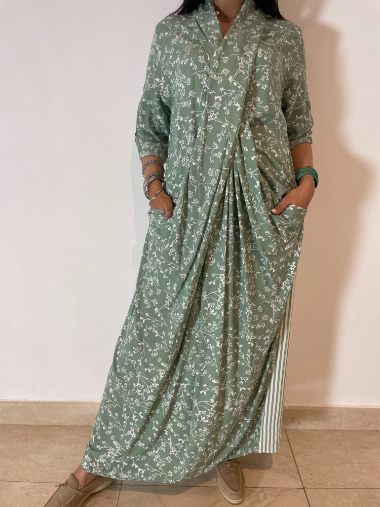 ثويب لف بخامتنا الباردة وبنقشة تهبل، الأكمام قابلة للتعديل تلبسينها بطريقتين