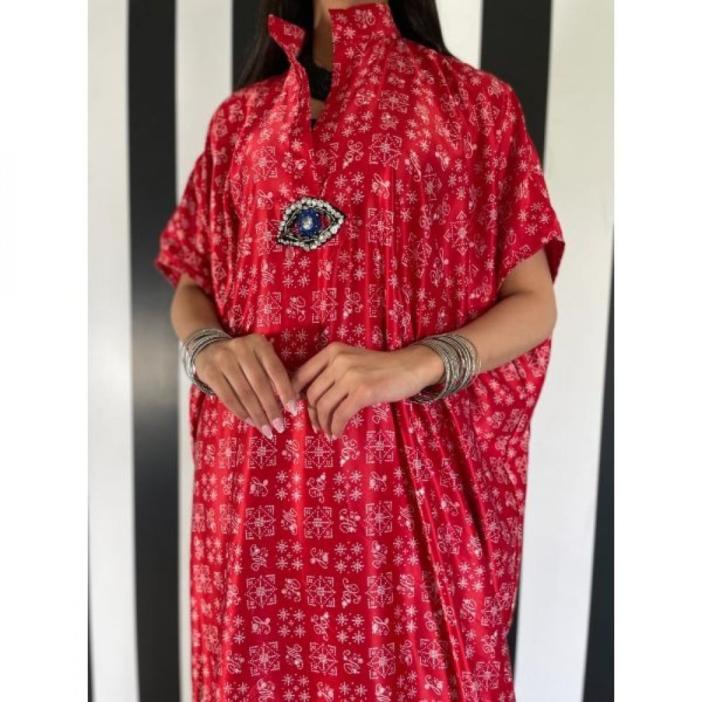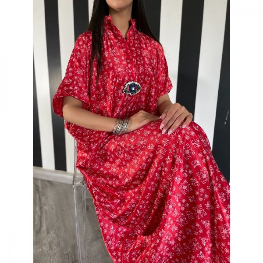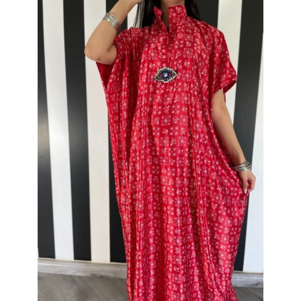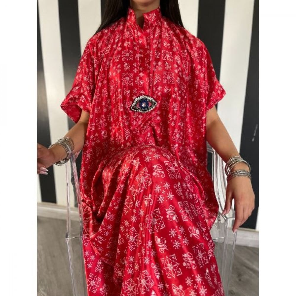 ثويب يومي بقماش الحرير الباردة وباللون الأحمر الزاهي و اضافة عين كريستالية