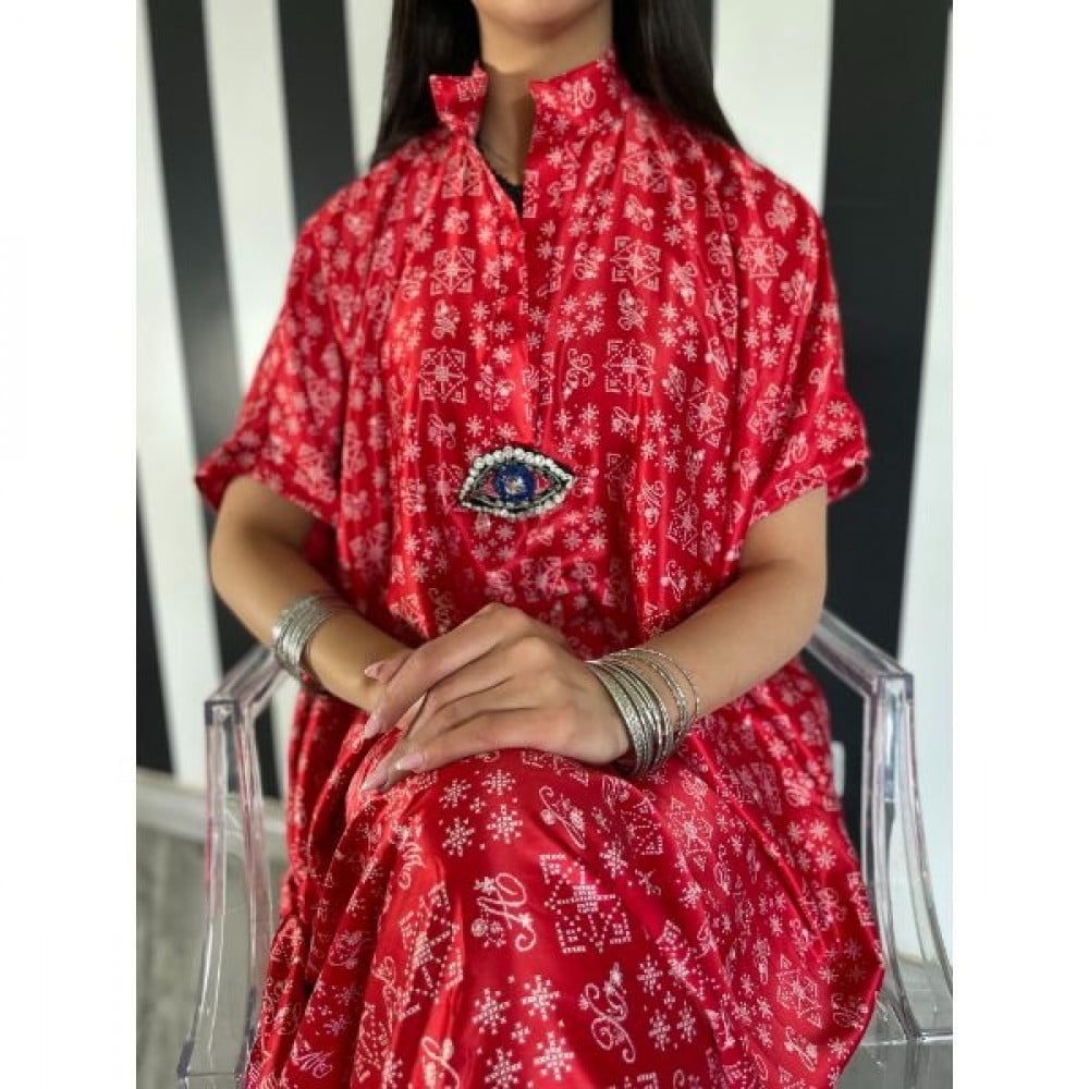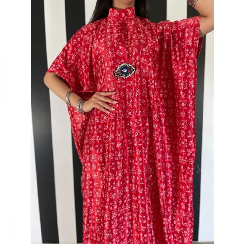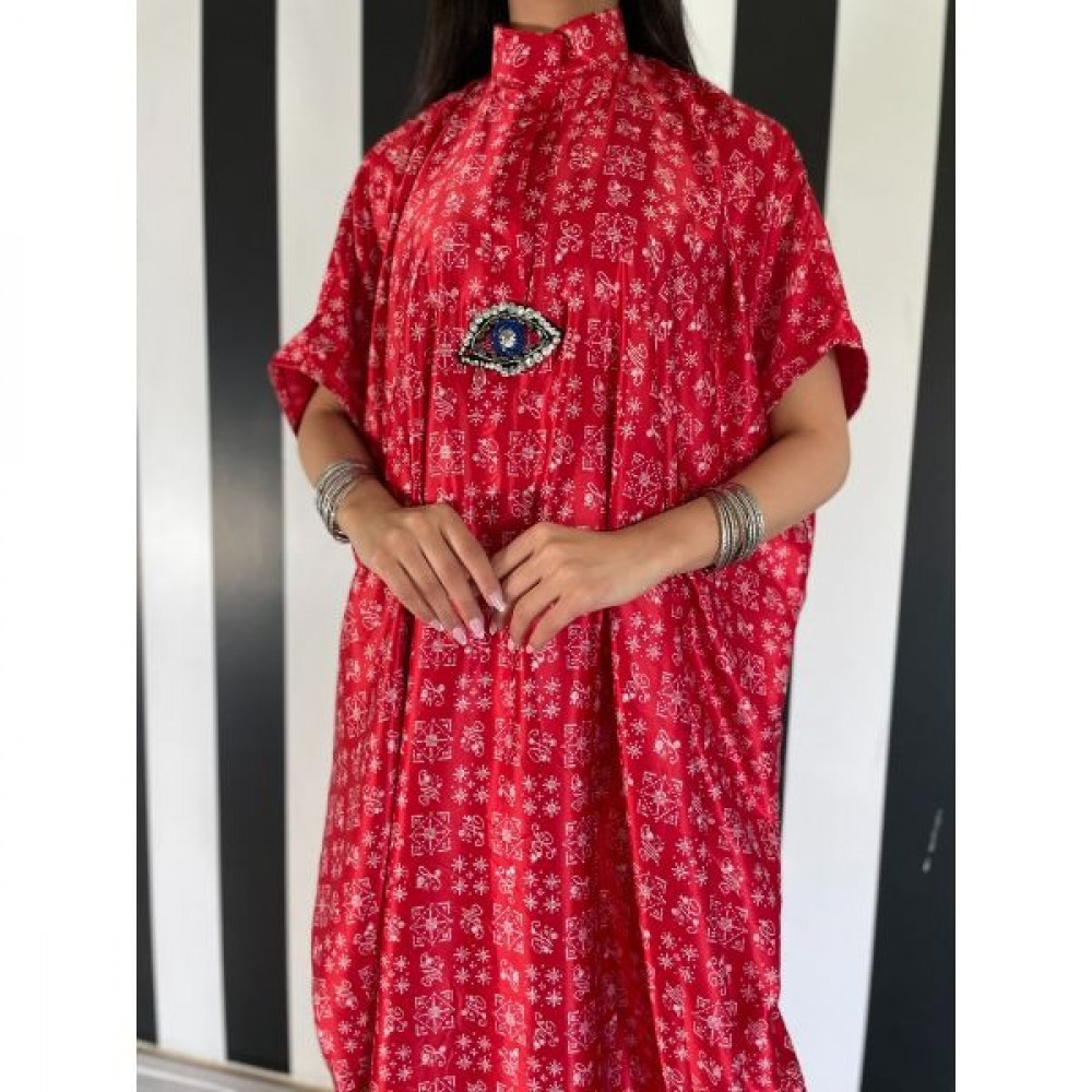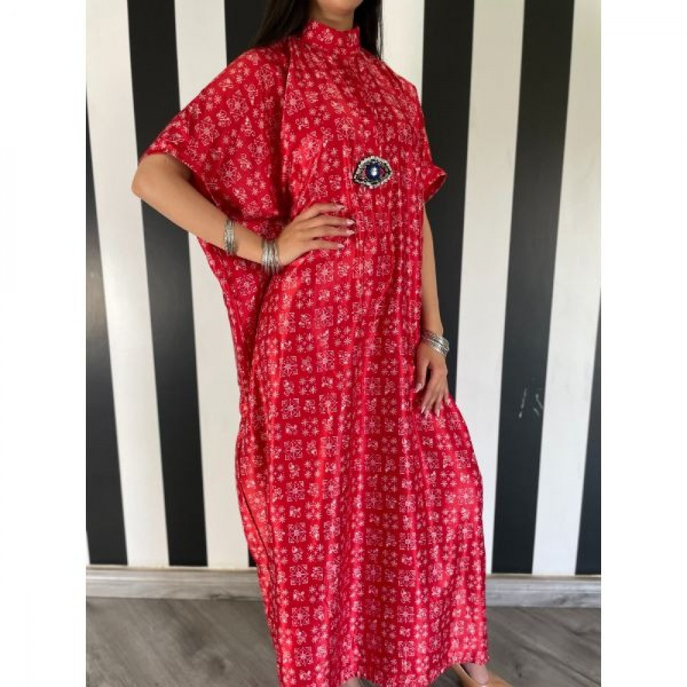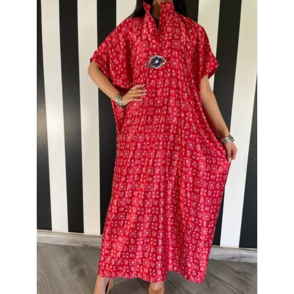 ثويب يومي بقماش الحرير الباردة وباللون الأحمر الزاهي و اضافة عين كريستالية