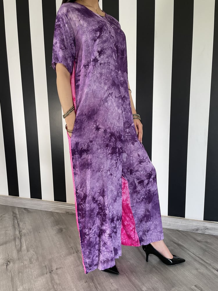ثويب قطن منقط وبجيوب مخفية وبلون البنفسج الأنيق وبإضافة طيور الفلامينغو الرائعة
