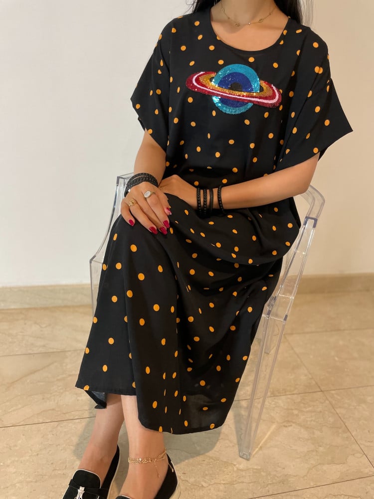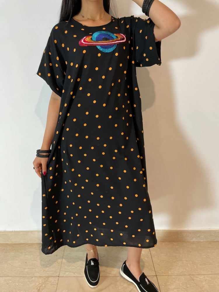 ثويب لف اسود منقط باللون الأبيض بإضافة مميزة من الخلف